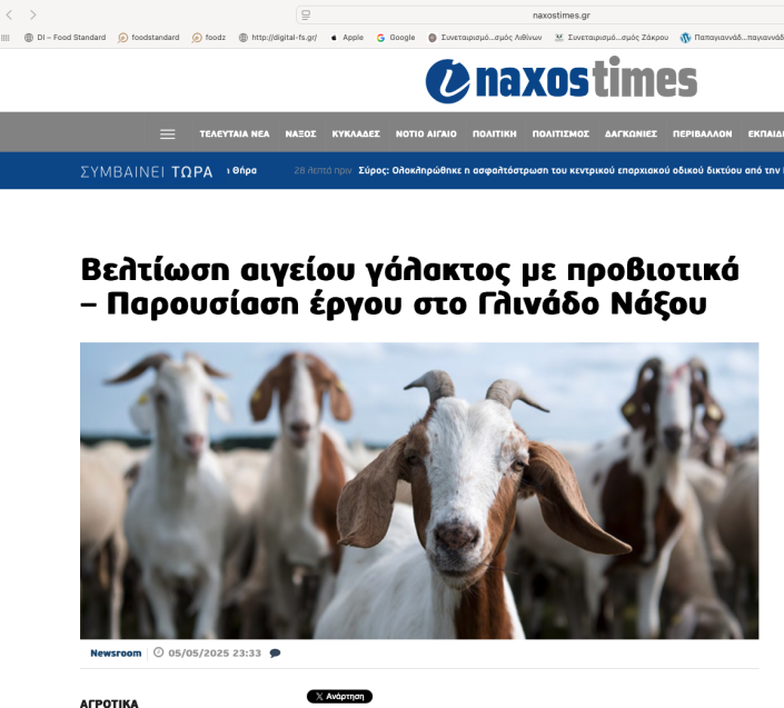 Την Παρασκευή 11 Απριλίου 2025, στο Γλινάδο της όμορφης Νάξου και πιο συγκεκριμένα στον χώρο εκδηλώσεων Έναστρον, πραγματοποιήθηκε εκδήλωση με σκοπό την παρουσίαση των αποτελεσμάτων του έργου Aigoplus με τίτλο ¨Βελτίωση της σύστασης και της ποσότητας του αιγείου γάλακτος μέσω χορήγησης στις αίγες συμπληρώματος διατροφής με το προβιοτικό στέλεχος Lactobacillus Plantrum PCA 236¨.